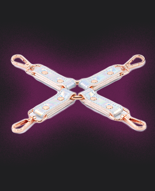 Light up the night with Cosmo's holographic hogtie. Accented with Rose Gold nickel free hardware and fully adjustable for universal fit. Made from easy to clean Vinyl.