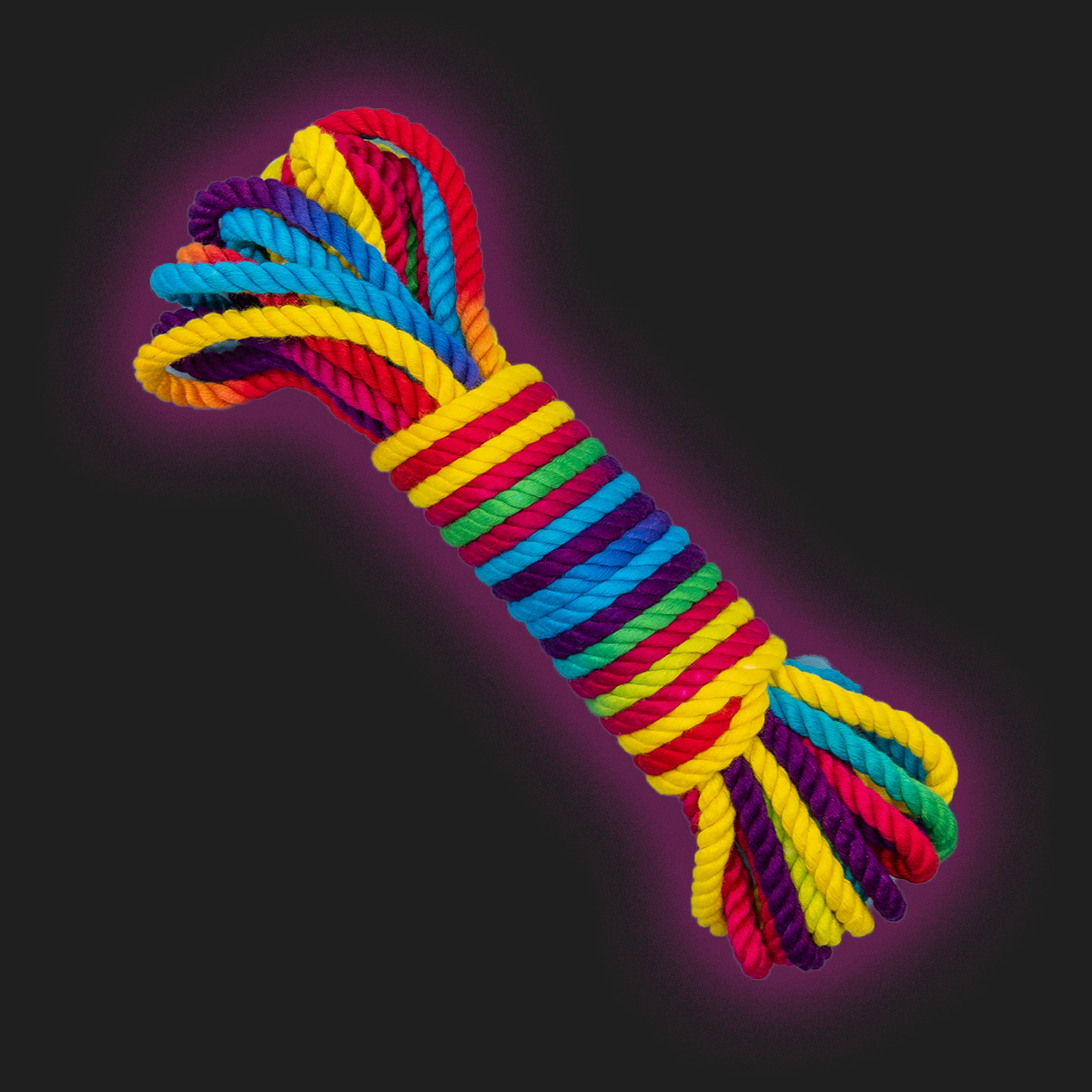 More environmentally friendly than cotton and softer than hemp, Emojibator's bamboo silk rainbow bondage rope bursts with color, comfort, and strength. Measuring 8 meters (approximately 26.25 feet) and 6mm in diameter, they are spun single-ply 3-strand for a medium-tight twist.