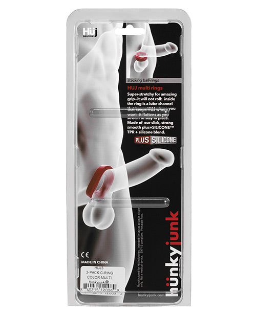 A 3-pack of sturdy and comfortable Hünkyjunk c-rings made of a stretchy silicone/TPR blend. Designed with a flatter inner opening, things stay in place and there wont be any rolling out of place! Keeps the ring from rolling so it won't snag or pinch HUJ c-ring has a groove inside the ring that flattens out when worn, this keeps the ring in place and keeps a bit of lube between the ring and the wearer for comfort. The 3 pack allows wearers to use one or two as ball stretchers while wearing the other at the base of their junk.