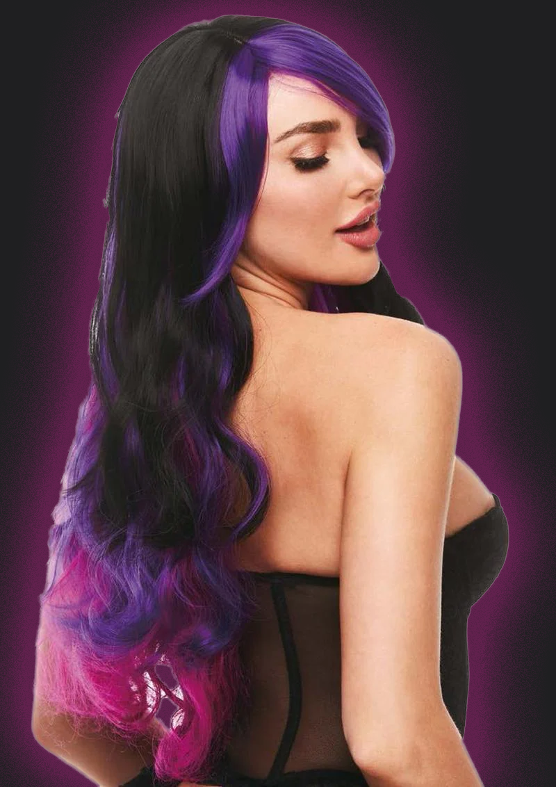 Is dark and mysterious the look you're going for? This side part look, with long sweeping bangs and a gentle curl to the ends, hits mid to lower back in length, and features a base black color. Thick front pieces are colored in a deep purple, with the same purple tone mingled with a hot pink on the underneath and ends. Spicy and fun and a sure way to change up your day to day look!